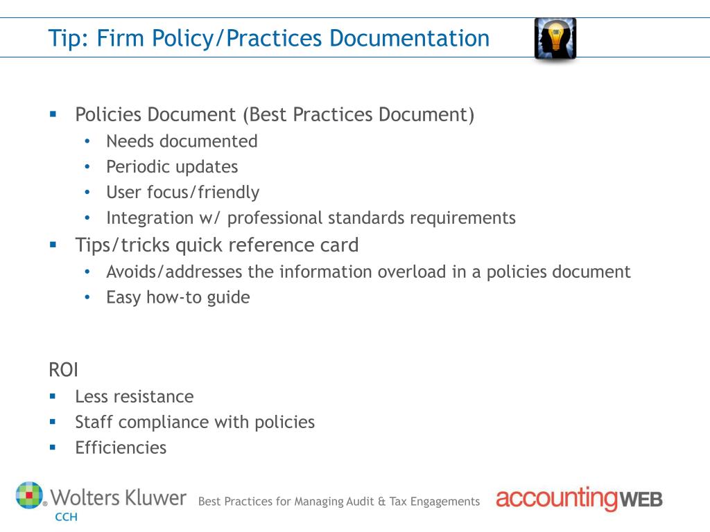 Tip: Firm Policy/Practices Documentation • Policies Document (Best Practices Document) • Needs documented • Periodic updates • User focus/friendly • Integration w/ professional standards requirements • Tips/tricks quick reference card • Avoids/addresses the information overload in a policies document • Easy how-to guide ROI • Less resistance • Staff compliance with policies • Efficiencies