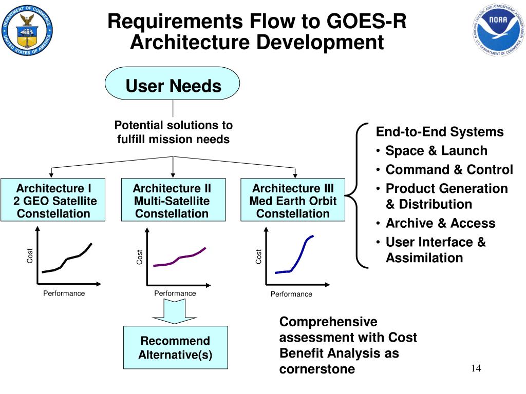Requirements Flow to GOES-R Architecture Development Cost Cost Cost Performance Performance Performance User Needs Potential solutions to fulfill mission needs End-to-End Systems • Space & Launch • Command & Control • Product Generation & Distribution • Archive & Access • User Interface & Assimilation Architecture I 2 GEO Satellite Constellation Architecture II Multi-Satellite Constellation Architecture III Med Earth Orbit Constellation Comprehensive assessment with Cost Benefit Analysis as cornerstone Recommend Alternative(s)