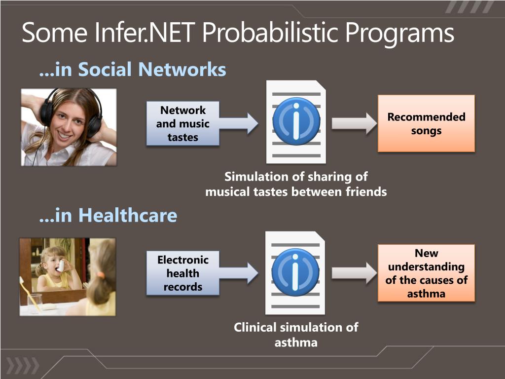 Some Infer.NET Probabilistic Programs ...in Social Networks Recommended songs Network and music tastes Simulation of sharing of musical tastes between friends ...in Healthcare New understanding of the causes of asthma Electronic health records Clinical simulation of asthma