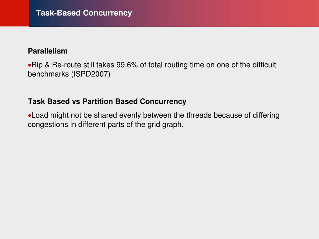Task-Based Concurrency Parallelism • Rip & Re-route still takes 99.6% of total routing time on one of the difficult benchmarks (ISPD2007) Task Based vs Partition Based Concurrency • Load might not be shared evenly between the threads because of differing congestions in different parts of the grid graph.