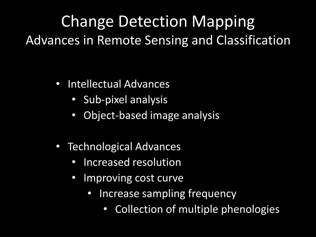 Change Detection MappingAdvances in Remote Sensing and Classification • Intellectual Advances • Sub-pixel analysis • Object-based image analysis • Technological Advances • Increased resolution • Improving cost curve • Increase sampling frequency • Collection of multiple phenologies
