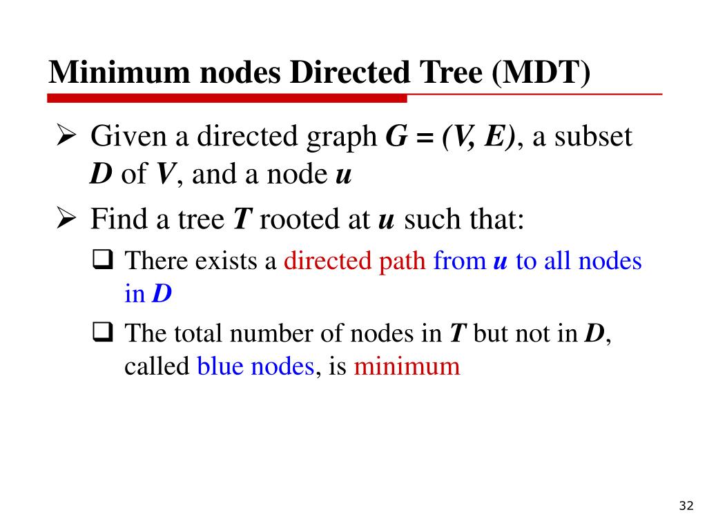Minimum nodes Directed Tree (MDT) • Given a directed graph G = (V, E), a subset D of V, and a node u • Find a tree T rooted at u such that: • There exists a directed pathfrom u to all nodes in D • The total number of nodes in T but not in D, called blue nodes, is minimum