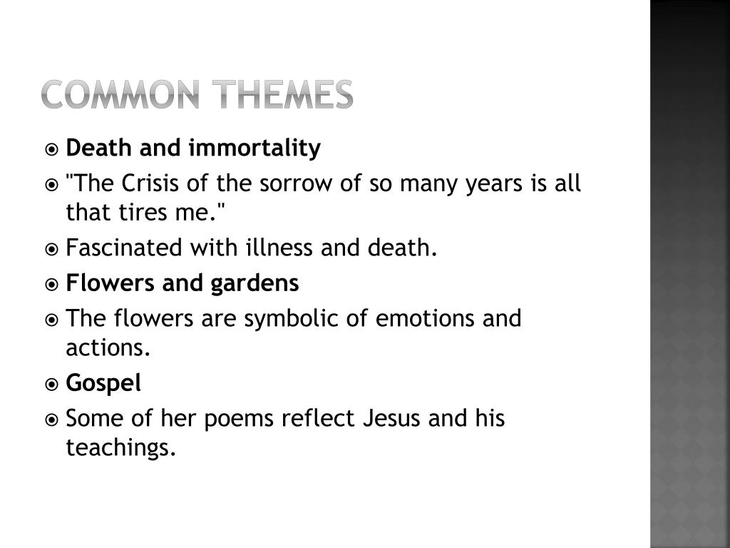 Common Themes • Death and immortality • "The Crisis of the sorrow of so many years is all that tires me." • Fascinated with illness and death. • Flowers and gardens • The flowers are symbolic of emotions and actions. • Gospel • Some of her poems reflect Jesus and his teachings.