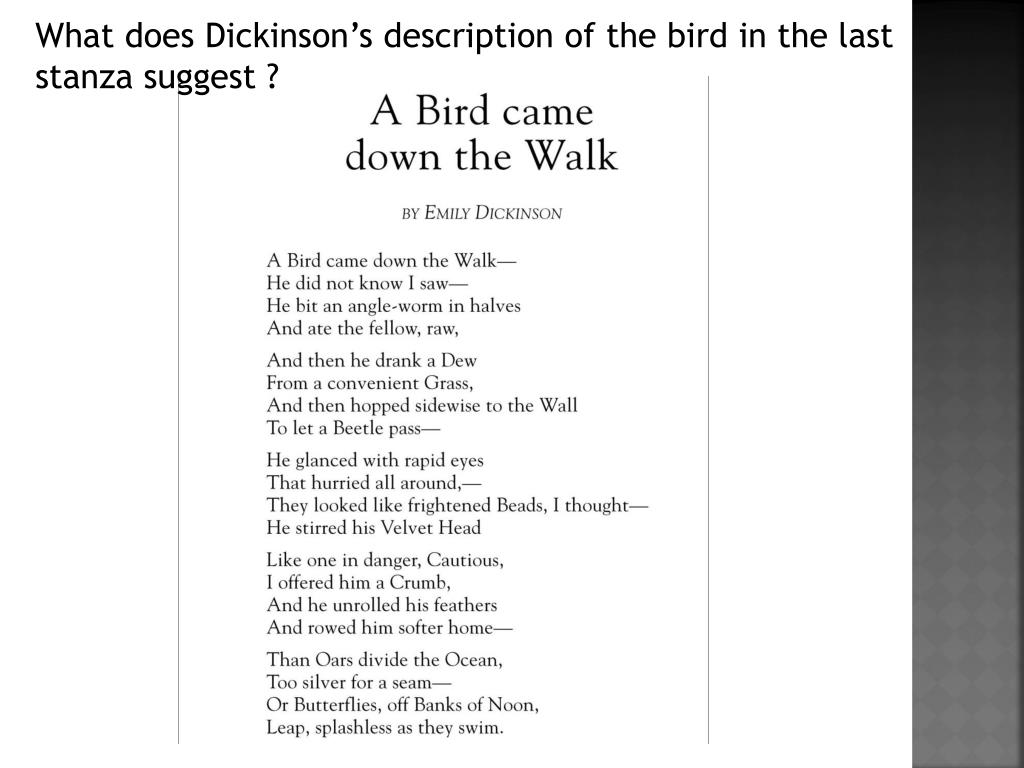 What does Dickinson’s description of the bird in the last stanza suggest ?