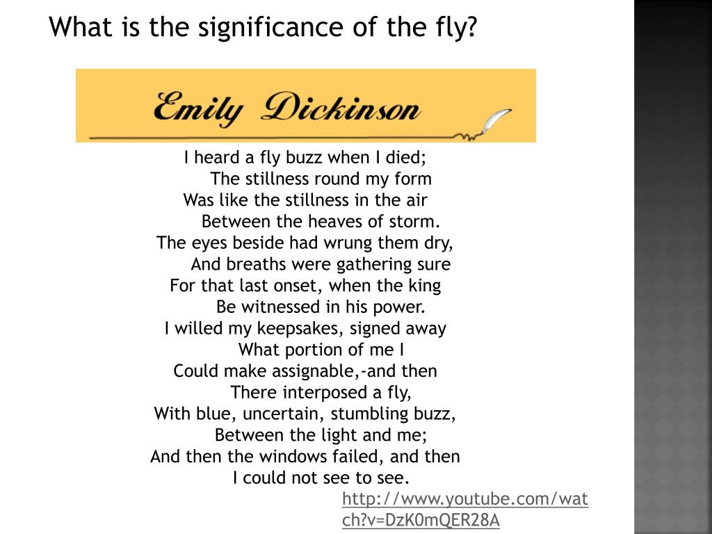 What is the significance of the fly? I heard a fly buzz when I died; The stillness round my formWas like the stillness in the air Between the heaves of storm. The eyes beside had wrung them dry, And breaths were gathering sureFor that last onset, when the king Be witnessed in his power. I willed my keepsakes, signed away What portion of me ICould make assignable,-and then There interposed a fly, With blue, uncertain, stumbling buzz, Between the light and me;And then the windows failed, and then I could not see to see. http://www.youtube.com/watch?v=DzK0mQER28A