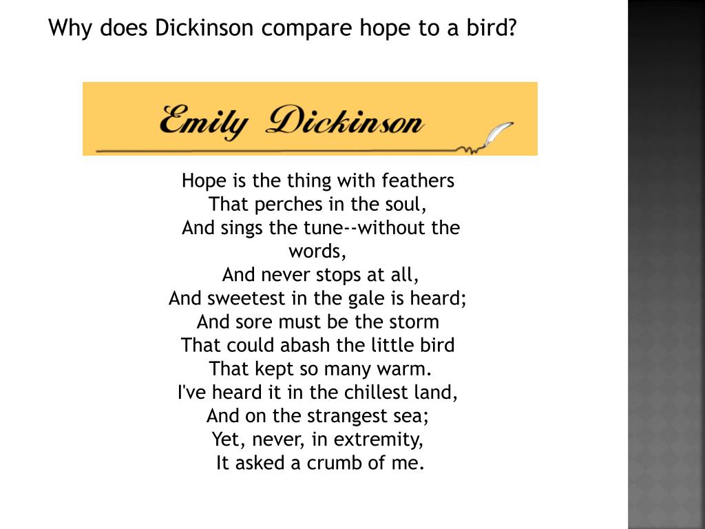 Why does Dickinson compare hope to a bird? Hope is the thing with feathers That perches in the soul, And sings the tune--without the words, And never stops at all, And sweetest in the gale is heard; And sore must be the storm That could abash the little bird That kept so many warm. I've heard it in the chillestland, And on the strangest sea; Yet, never, in extremity, It asked a crumb of me.