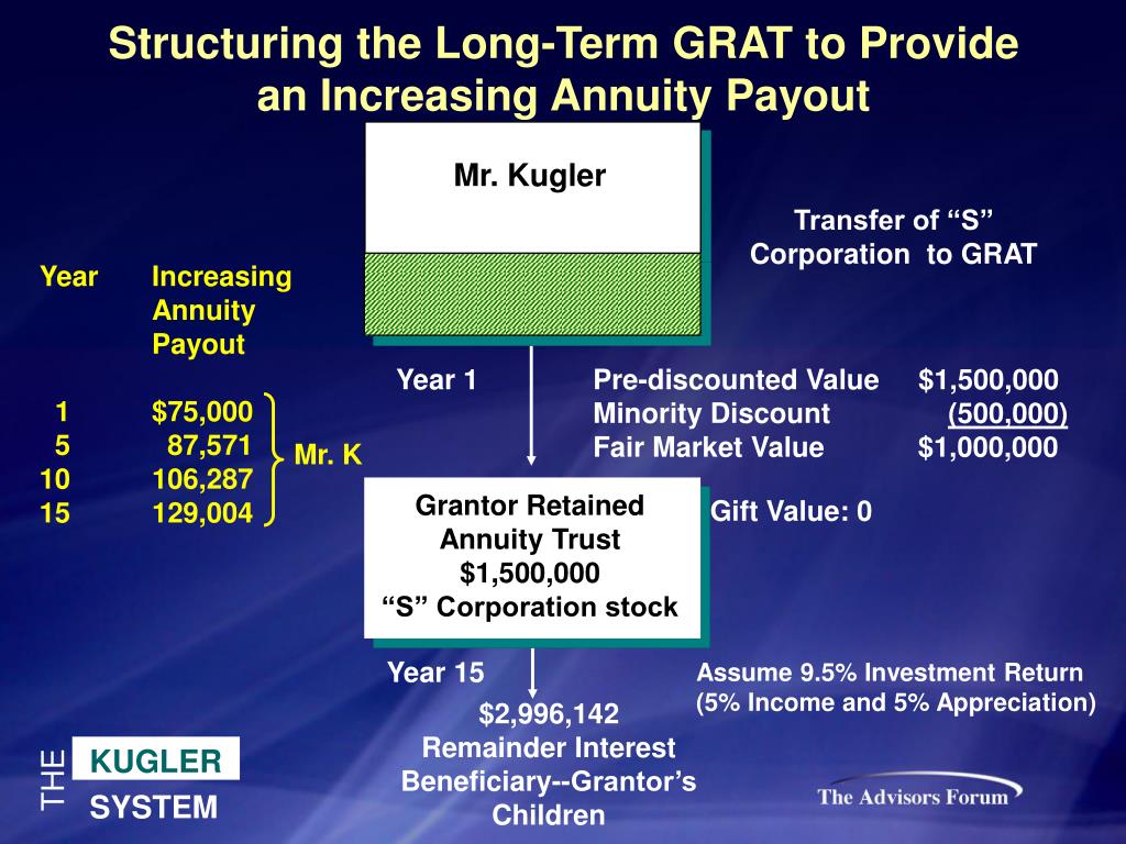 T H E. S Y S T E M. K U G L E R. The Continuing Usefulness of GRATs. Presented by: Frank L. Rainaldi, CLU, ChFC. Analysis of Long Term Maximum Annuity GRAT Calculation. Initial Value of Asset Transferred to GRAT $1,000,000. Present Value of $93,342 15-year Annuity