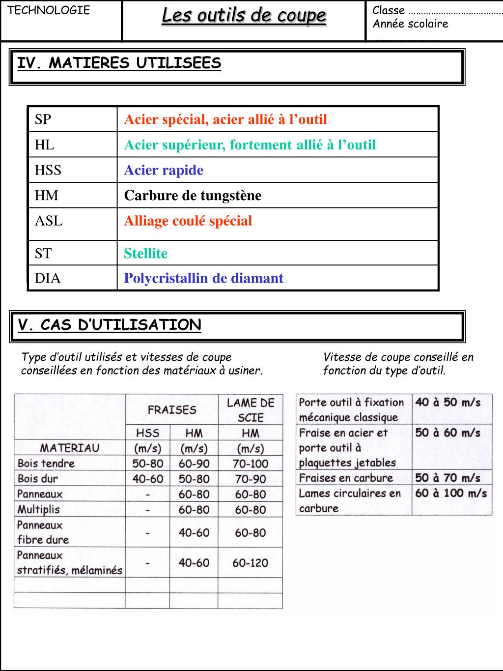 TECHNOLOGIE Les outils de coupe Classe ……………………………….. Année scolaire ……………………… IV. MATIERES UTILISEES V. CAS D’UTILISATION Type d’outil utilisés et vitesses de coupe conseillées en fonction des matériaux à usiner. Vitesse de coupe conseillé en fonction du type d’outil.
