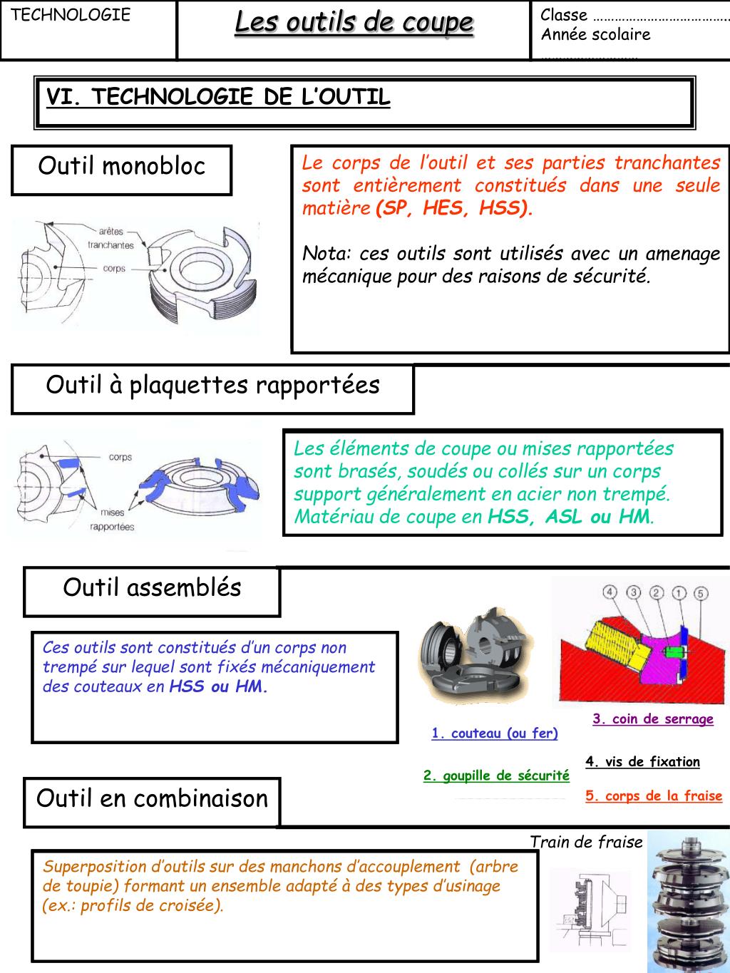 TECHNOLOGIE Les outils de coupe Classe ……………………………….. Année scolaire ……………………… VI. TECHNOLOGIE DE L’OUTIL Outil monobloc ____________________________________________________________________________________________________________________________________________ Nota: ces outils sont utilisés avec un amenage mécanique pour des raisons de sécurité. Le corps de l’outil et ses parties tranchantes sont entièrement constitués dans une seule matière (SP, HES, HSS). Nota: ces outils sont utilisés avec un amenage mécanique pour des raisons de sécurité. Outil à plaquettes rapportées ____________________________________________________________________________________________________________________________________________ Les éléments de coupe ou mises rapportées sont brasés, soudés ou collés sur un corps support généralement en acier non trempé. Matériau de coupe en HSS, ASL ou HM. Outil assemblés _____________________________________________________________________________________________________________________________________________________________________ Ces outils sont constitués d’un corps non trempé sur lequel sont fixés mécaniquement des couteaux en HSS ou HM. 3. coin de serrage 3. _____________ 1. couteau (ou fer) 1. _____________ 4. vis de fixation 4. _____________ 2. goupille de sécurité Outil en combinaison 2. _____________ 5. corps de la fraise 5. _____________ Train de fraise ___________________________________________________________________________________________________________________________________________________________________________________________________________________________________________ Superposition d’outils sur des manchons d’accouplement (arbre de toupie) formant un ensemble adapté à des types d’usinage (ex.: profils de croisée).