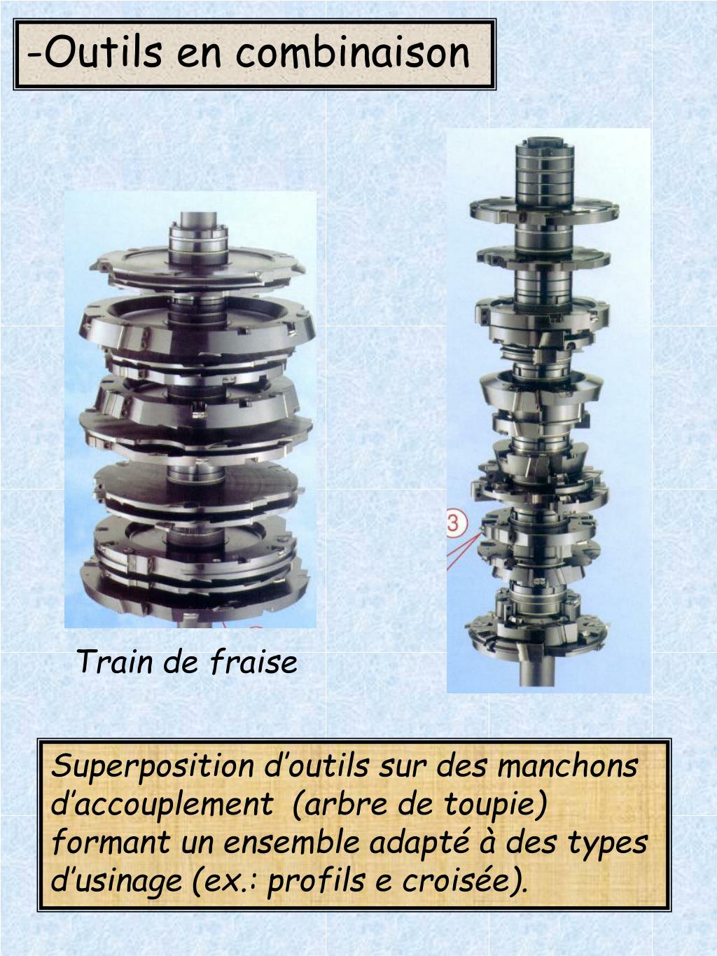 -Outils en combinaison Train de fraise Superposition d’outils sur des manchons d’accouplement (arbre de toupie) formant un ensemble adapté à des types d’usinage (ex.: profils e croisée).
