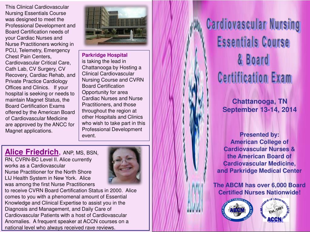ACCN ACCN AMERICAN BOARD OF CARDIOVASCULAR MEDICINE AMERICAN BOARD OF CARDIOVASCULAR MEDICINE ABCM ABCM Est. 1991 Est. 1991 This Clinical Cardiovascular Nursing Essentials Course was designed to meet the Professional Development and Board Certification needs of your Cardiac Nurses and Nurse Practitioners working in PCU, Telemetry, Emergency Chest Pain Centers, Cardiovascular Critical Care, Cath Lab, CV Surgery, CV Recovery, Cardiac Rehab, and Private Practice Cardiology Offices and Clinics. If your hospital is seeking or needs to maintain Magnet Status, the Board Certification Exams offered by the American Board of Cardiovascular Medicine are approved by the ANCC for Magnet applications. Cardiovascular Nursing Essentials Course & Board Certification Exam Parkridge Hospitalis taking the lead in Chattanooga by Hosting a Clinical Cardiovascular Nursing Course and CVRN Board Certification Opportunity for area Cardiac Nurses and Nurse Practitioners, and those throughout the region at other Hospitals and Clinics who wish to take part in this Professional Development event. Chattanooga, TN September 13-14, 2014 Presented by:American College of Cardiovascular Nurses &the American Board of Cardiovascular Medicine, and Parkridge Medical Center The ABCM has over 6,000 Board Certified Nurses Nationwide! Alice Friedrich, ANP, MS, BSN, RN, CVRN-BC Level II. Alice currently works as a Cardiovascular Nurse Practitioner for the North Shore LIJ Health System in New York. Alice was among the first Nurse Practitioners to receive CVRN Board Certification Status in 2000. Alice comes to you with a phenomenal amount of Essential Knowledge and Clinical Expertise to assist you in the Diagnosis and Management, and Daily Care of Cardiovascular Patients with a host of Cardiovascular Anomalies. A frequent speaker at ACCN courses on a national levelwho always received rave reviews.