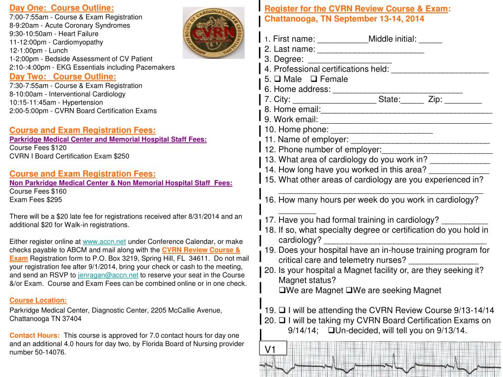Day One: Course Outline: 7:00-7:55am - Course & Exam Registration 8-9:20am - Acute Coronary Syndromes9:30-10:50am - Heart Failure 11-12:00pm - Cardiomyopathy 12-1:00pm - Lunch 1-2:00pm - Bedside Assessment of CV Patient 2:10-:4:00pm - EKG Essentials including Pacemakers Day Two: Course Outline: 7:30-7:55am - Course & Exam Registration 8-10:00am - Interventional Cardiology10:15-11:45am - Hypertension 2:00-5:00pm - CVRN Board Certification ExamsCourse and Exam Registration Fees: Parkridge Medical Center and Memorial Hospital StaffFees: Course Fees $120CVRN I Board Certification Exam $250Course and Exam Registration Fees: Non Parkridge Medical Center & Non Memorial Hospital Staff Fees: Course Fees $160Exam Fees $295There will be a $20 late fee for registrations received after 8/31/2014 and an additional $20 for Walk-in registrations.Either register online at www.accn.net under Conference Calendar, or make checks payable to ABCM and mail along with the CVRN Review Course & ExamRegistration form to P.O. Box 3219, Spring Hill, FL 34611. Do not mail your registration fee after 9/1/2014, bring your check or cash to the meeting, and send an RSVP to jenragan@accn.net to reserve your seat in the Course &/or Exam. Course and Exam Fees can be combined online or in one check. Course Location: Parkridge Medical Center, Diagnostic Center, 2205 McCallie Avenue, Chattanooga TN 37404 Contact Hours:This course is approved for 7.0 contact hours for day one and an additional 4.0 hours for day two, by Florida Board of Nursing provider number 50-14076. Register for the CVRN Review Course & Exam: Chattanooga, TN September 13-14, 2014 1. First name: ___________Middle initial: _____ 2. Last name: _______________________ 3. Degree: __________________4. Professional certifications held: _____________________5. q Male q Female 6. Home address: ____________________________ 7. City: __________________ State:_____ Zip: ________ 8. Home email:_____________________________________9. Work email: _____________________________________10. Home phone: ______________________ 11. Name of employer: ______________________________ 12. Phone number of employer:________________________13. What area of cardiology do you work in? _____________14. How long have you worked in this area? _____________ 15. What other areas of cardiology are you experienced in? ____________________________________________ 16. How many hours per week do you work in cardiology? ________17. Have you had formal training in cardiology? __________ 18. If so, what specialty degree or certification do you hold in cardiology? ___________________________________19. Does your hospital have an in-house training program for critical care and telemetry nurses? _______________20. Is your hospital a Magnet facility or, are they seeking it? Magnet status? qWe are Magnet qWe are seeking Magnet19. q I will be attending the CVRN Review Course 9/13-14/14 20. q I will be taking my CVRN Board Certification Exams on 9/14/14; qUn-decided, will tell you on 9/13/14. V1
