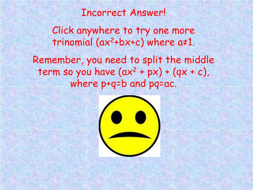 Incorrect Answer! Click anywhere to try another trinomial with a leading coefficient not equal to 1.