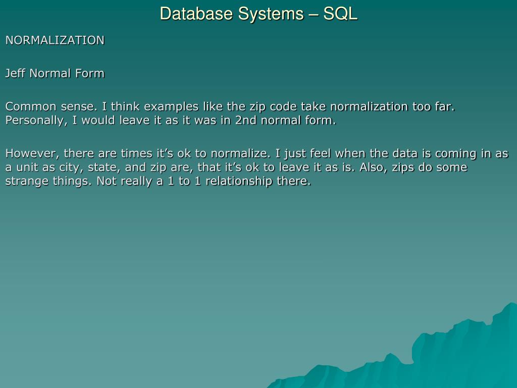 Database Systems – SQL NORMALIZATION Jeff Normal Form Common sense. I think examples like the zip code take normalization too far. Personally, I would leave it as it was in 2nd normal form. However, there are times it’s ok to normalize. I just feel when the data is coming in as a unit as city, state, and zip are, that it’s ok to leave it as is. Also, zips do some strange things. Not really a 1 to 1 relationship there.