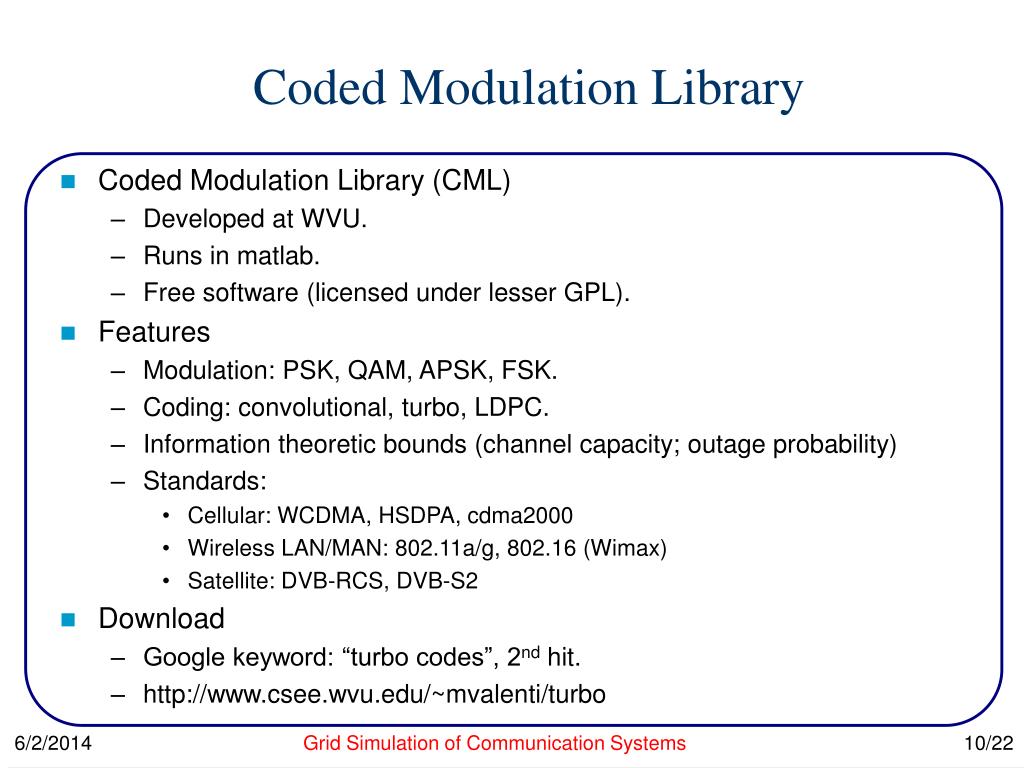 Coded Modulation Library • Coded Modulation Library (CML) • Developed at WVU. • Runs in matlab. • Free software (licensed under lesser GPL). • Features • Modulation: PSK, QAM, APSK, FSK. • Coding: convolutional, turbo, LDPC. • Information theoretic bounds (channel capacity; outage probability) • Standards: • Cellular: WCDMA, HSDPA, cdma2000 • Wireless LAN/MAN: 802.11a/g, 802.16 (Wimax) • Satellite: DVB-RCS, DVB-S2 • Download • Google keyword: “turbo codes”, 2nd hit. • http://www.csee.wvu.edu/~mvalenti/turbo Grid Simulation of Communication Systems