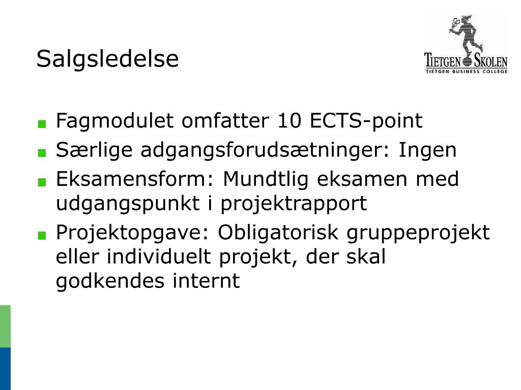 Salgsledelse • Fagmodulet omfatter 10 ECTS-point • Særlige adgangsforudsætninger: Ingen • Eksamensform: Mundtlig eksamen med udgangspunkt i projektrapport • Projektopgave: Obligatorisk gruppeprojekt eller individuelt projekt, der skal godkendes internt