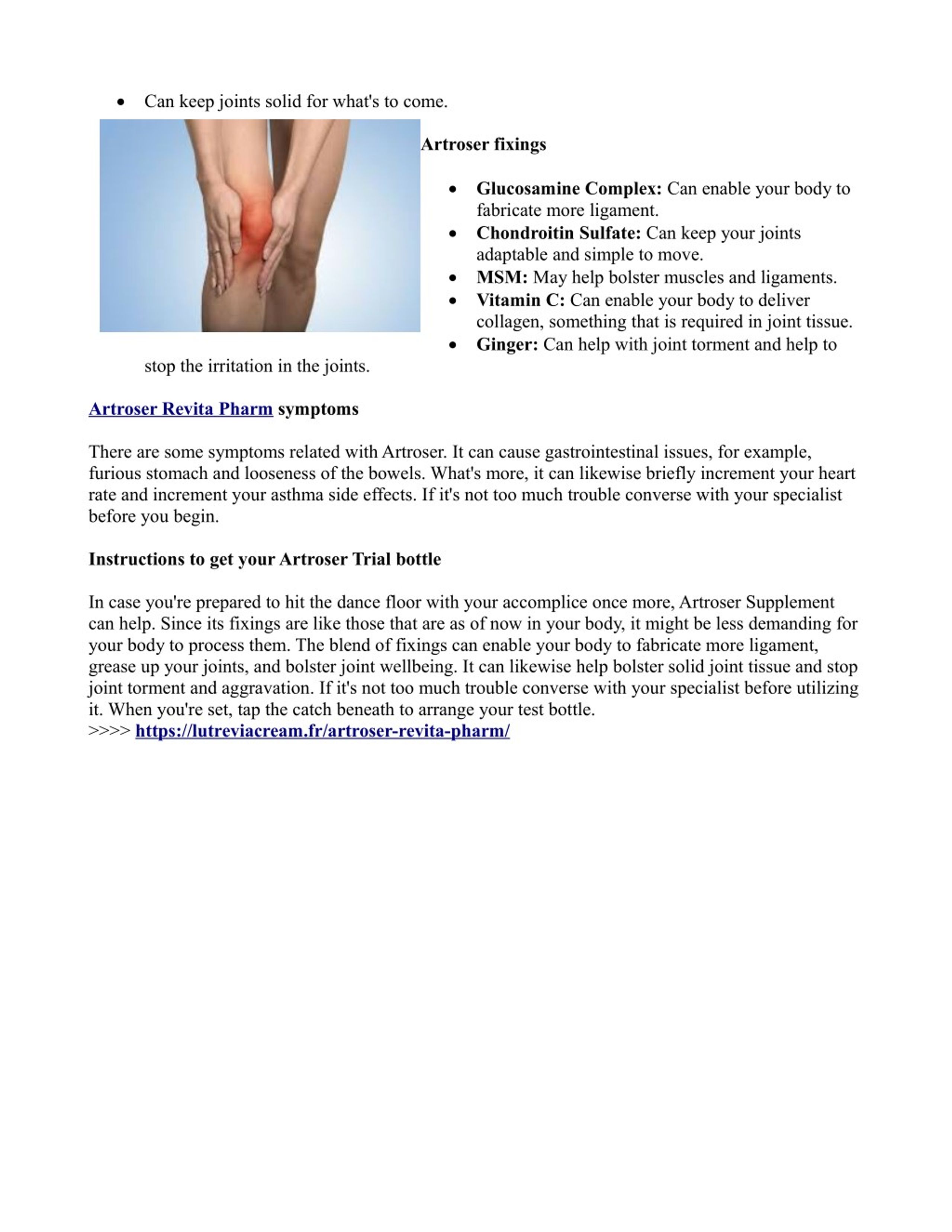 Can keep joints solid for what's to come. Artroser fixings Glucosamine Complex: Can enable your body to fabricate more ligament. Chondroitin Sulfate: Can keep your joints adaptable and simple to move. MSM: May help bolster muscles and ligaments. Vitamin C: Can enable your body to deliver collagen, something that is required in joint tissue. Ginger: Can help with joint torment and help to stop the irritation in the joints. Artroser Revita Pharm symptoms There are some symptoms related with Artroser. It can cause gastrointestinal issues, for example, furious stomach and looseness of the bowels. What's more, it can likewise briefly increment your heart rate and increment your asthma side effects. If it's not too much trouble converse with your specialist before you begin. Instructions to get your Artroser Trial bottle In case you're prepared to hit the dance floor with your accomplice once more, Artroser Supplement can help. Since its fixings are like those that are as of now in your body, it might be less demanding for your body to process them. The blend of fixings can enable your body to fabricate more ligament, grease up your joints, and bolster joint wellbeing. It can likewise help bolster solid joint tissue and stop joint torment and aggravation. If it's not too much trouble converse with your specialist before utilizing it. When you're set, tap the catch beneath to arrange your test bottle. >>>> https://lutreviacream.fr/artroser-revita-pharm/