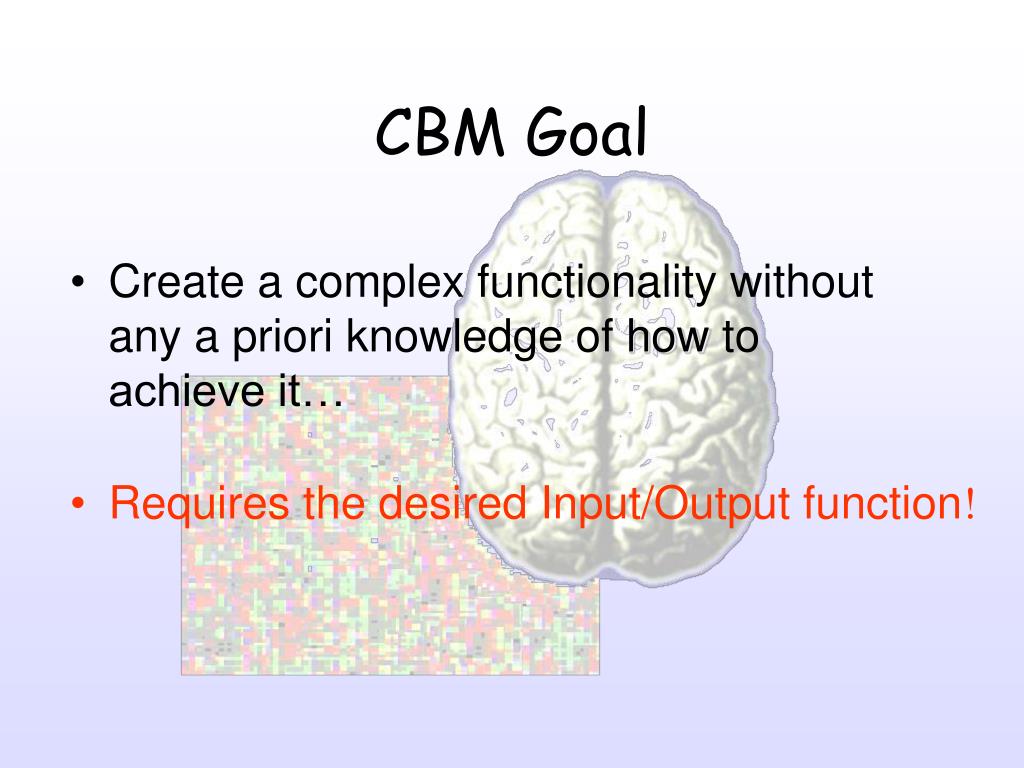 CBM Goal • Create a complex functionality without any a priori knowledge of how to achieve it… • Requires the desired Input/Output function!