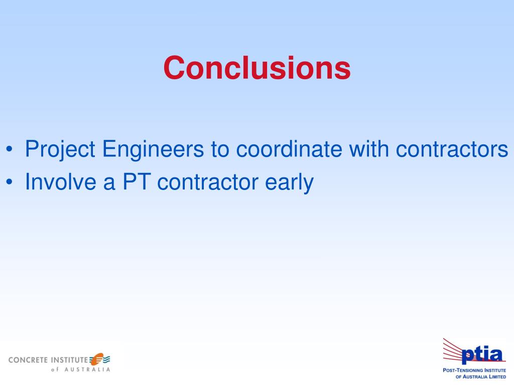 Conclusions Project Engineers to coordinate with contractors Involve a PT contractor early