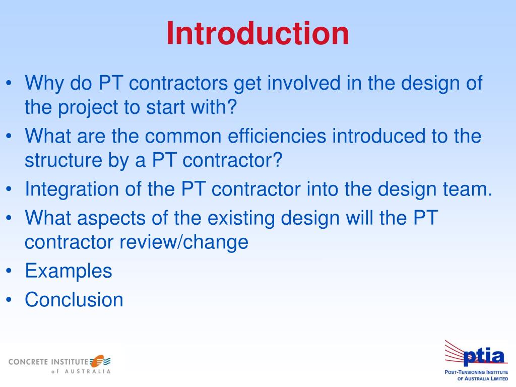 Introduction Why do PT contractors get involved in the design of the project to start with? What are the common efficiencies introduced to the structure by a PT contractor? Integration of the PT contractor into the design team. What aspects of the existing design will the PT contractor review/change Examples Conclusion