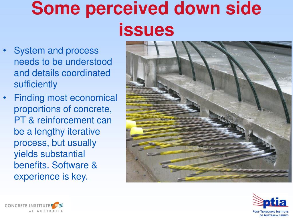Some perceived down side issues System and process needs to be understood and details coordinated sufficiently Finding most economical proportions of concrete, PT & reinforcement can be a lengthy iterative process, but usually yields substantial benefits. Software & experience is key.