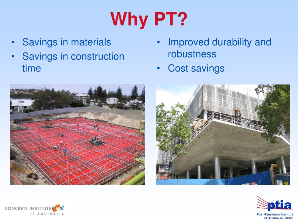 Why PT? Savings in materials Savings in construction time Improved durability and robustness Cost savings