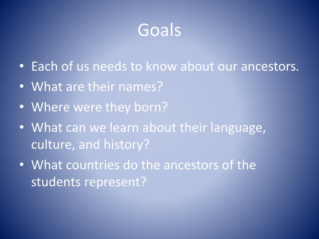 Goals • Each of us needs to know about our ancestors. • What are their names? • Where were they born? • What can we learn about their language, culture, and history? • What countries do the ancestors of the students represent?