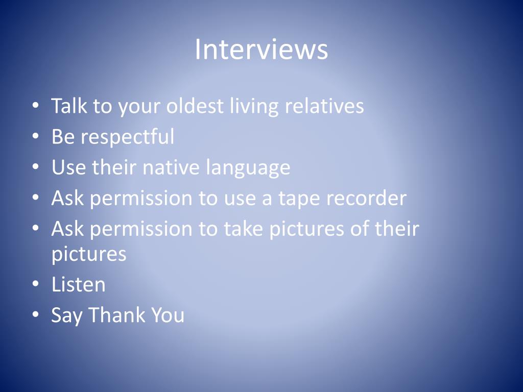 Interviews • Talktoyouroldest living relatives • Be respectful • Use theirnativelanguage • Ask permissionto use a tape recorder • Ask permissiontotakepictures of theirpictures • Listen • SayThankYou
