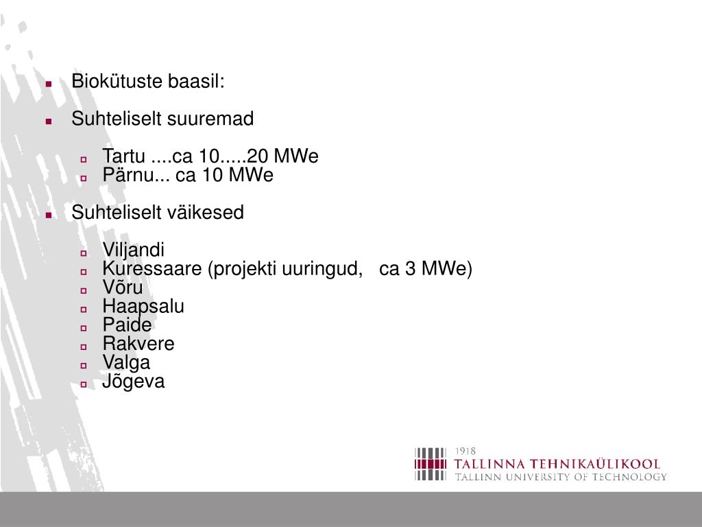 Biokütuste baasil: • Suhteliselt suuremad • Tartu ....ca 10.....20 MWe • Pärnu... ca 10 MWe • Suhteliselt väikesed • Viljandi • Kuressaare (projekti uuringud, ca 3 MWe) • Võru • Haapsalu • Paide • Rakvere • Valga • Jõgeva