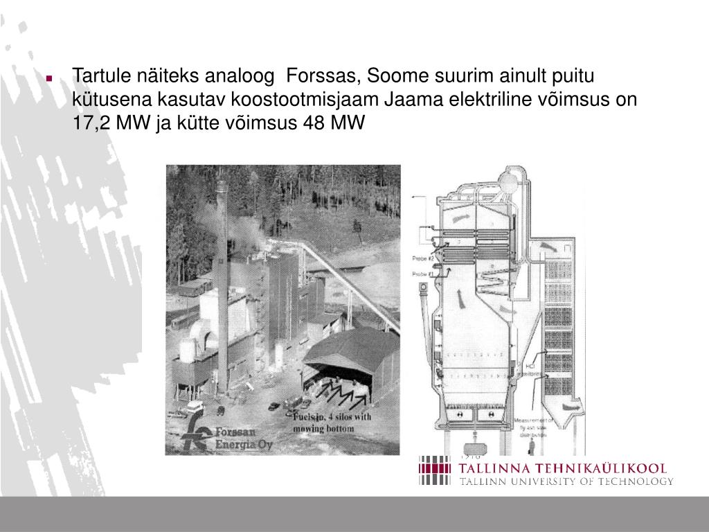 Tartule näiteks analoog Forssas, Soome suurim ainult puitu kütusena kasutav koostootmisjaam Jaama elektriline võimsus on 17,2 MW ja kütte võimsus 48 MW