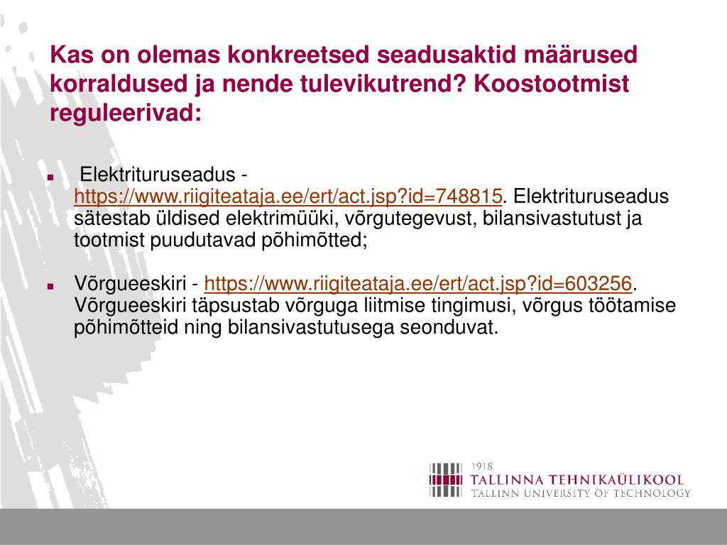 Kas on olemas konkreetsed seadusaktid määrused korraldused ja nende tulevikutrend? Koostootmist reguleerivad: • Elektrituruseadus - https://www.riigiteataja.ee/ert/act.jsp?id=748815. Elektrituruseadus sätestab üldised elektrimüüki, võrgutegevust, bilansivastutust ja tootmist puudutavad põhimõtted; • Võrgueeskiri - https://www.riigiteataja.ee/ert/act.jsp?id=603256. Võrgueeskiri täpsustab võrguga liitmise tingimusi, võrgus töötamise põhimõtteid ning bilansivastutusega seonduvat.