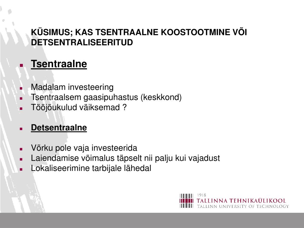 KÜSIMUS; KAS TSENTRAALNE KOOSTOOTMINE VÕI DETSENTRALISEERITUD • Tsentraalne • Madalam investeering • Tsentraalsem gaasipuhastus (keskkond) • Tööjõukulud väiksemad ? • Detsentraalne • Võrku pole vaja investeerida • Laiendamise võimalus täpselt nii palju kui vajadust • Lokaliseerimine tarbijale lähedal
