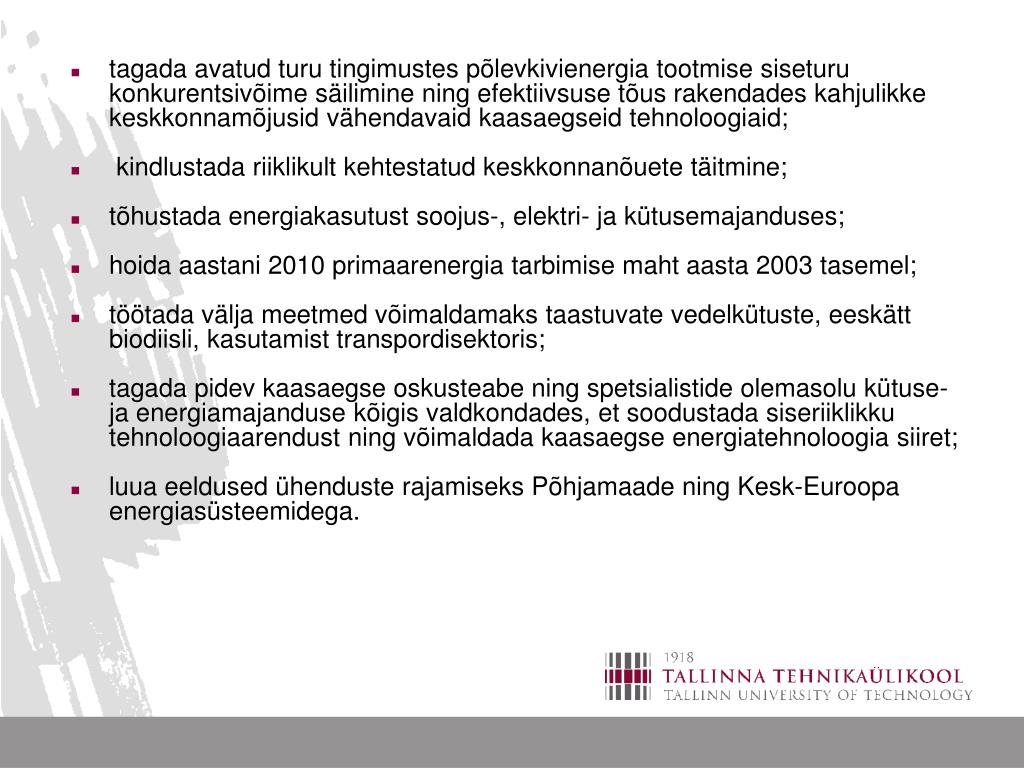 tagada avatud turu tingimustes põlevkivienergia tootmise siseturu konkurentsivõime säilimine ning efektiivsuse tõus rakendades kahjulikke keskkonnamõjusid vähendavaid kaasaegseid tehnoloogiaid; • kindlustada riiklikult kehtestatud keskkonnanõuete täitmine; • tõhustada energiakasutust soojus-, elektri- ja kütusemajanduses; • hoida aastani 2010 primaarenergia tarbimise maht aasta 2003 tasemel; • töötada välja meetmed võimaldamaks taastuvate vedelkütuste, eeskätt biodiisli, kasutamist transpordisektoris; • tagada pidev kaasaegse oskusteabe ning spetsialistide olemasolu kütuse- ja energiamajanduse kõigis valdkondades, et soodustada siseriiklikku tehnoloogiaarendust ning võimaldada kaasaegse energiatehnoloogia siiret; • luua eeldused ühenduste rajamiseks Põhjamaade ning Kesk-Euroopa energiasüsteemidega.