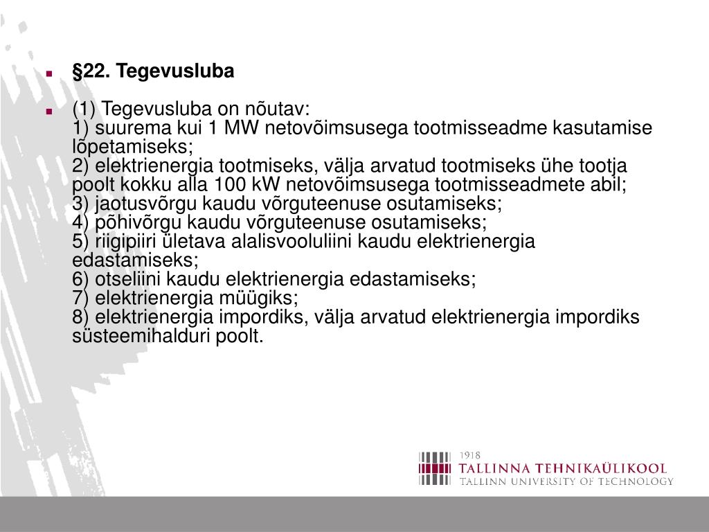 §22. Tegevusluba • (1) Tegevusluba on nõutav:1) suurema kui 1 MW netovõimsusega tootmisseadme kasutamise lõpetamiseks;2) elektrienergia tootmiseks, välja arvatud tootmiseks ühe tootja poolt kokku alla 100 kW netovõimsusega tootmisseadmete abil;3) jaotusvõrgu kaudu võrguteenuse osutamiseks;4) põhivõrgu kaudu võrguteenuse osutamiseks;5) riigipiiri ületava alalisvooluliini kaudu elektrienergia edastamiseks;6) otseliini kaudu elektrienergia edastamiseks;7) elektrienergia müügiks;8) elektrienergia impordiks, välja arvatud elektrienergia impordiks süsteemihalduri poolt.