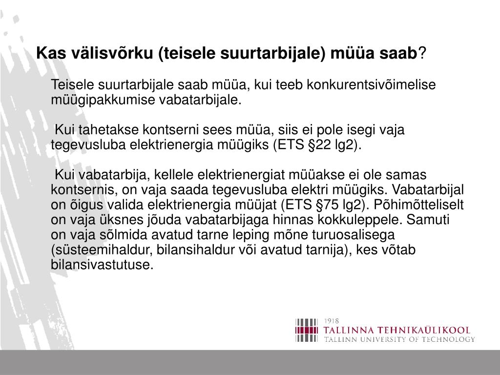 Kas välisvõrku (teisele suurtarbijale) müüa saab? Teisele suurtarbijale saab müüa, kui teeb konkurentsivõimelise müügipakkumise vabatarbijale. Kui tahetakse kontserni sees müüa, siis ei pole isegi vaja tegevusluba elektrienergia müügiks (ETS §22 lg2). Kui vabatarbija, kellele elektrienergiat müüakse ei ole samas kontsernis, on vaja saada tegevusluba elektri müügiks. Vabatarbijal on õigus valida elektrienergia müüjat (ETS §75 lg2). Põhimõtteliselt on vaja üksnes jõuda vabatarbijaga hinnas kokkuleppele. Samuti on vaja sõlmida avatud tarne leping mõne turuosalisega (süsteemihaldur, bilansihaldur või avatud tarnija), kes võtab bilansivastutuse.