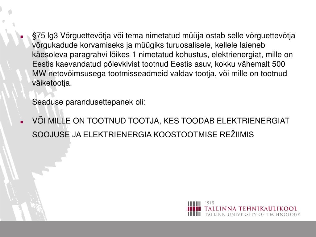 §75 lg3 Võrguettevõtja või tema nimetatud müüja ostab selle võrguettevõtja võrgukadude korvamiseks ja müügiks turuosalisele, kellele laieneb käesoleva paragrahvi lõikes 1 nimetatud kohustus, elektrienergiat, mille on Eestis kaevandatud põlevkivist tootnud Eestis asuv, kokku vähemalt 500 MW netovõimsusega tootmisseadmeid valdav tootja, või mille on tootnud väiketootja. Seaduse parandusettepanek oli: • VÕI MILLE ON TOOTNUD TOOTJA, KES TOODAB ELEKTRIENERGIAT SOOJUSE JA ELEKTRIENERGIA KOOSTOOTMISE REŽIIMIS