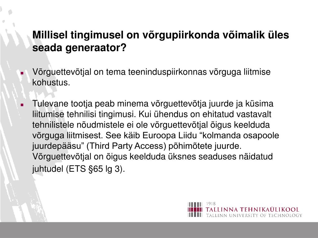 Millisel tingimusel on võrgupiirkonda võimalik üles seada generaator? • Võrguettevõtjal on tema teeninduspiirkonnas võrguga liitmise kohustus. • Tulevane tootja peab minema võrguettevõtja juurde ja küsima liitumise tehnilisi tingimusi. Kui ühendus on ehitatud vastavalt tehnilistele nõudmistele ei ole võrguettevõtjal õigus keelduda võrguga liitmisest. See käib Euroopa Liidu “kolmanda osapoole juurdepääsu” (Third Party Access) põhimõtete juurde. Võrguettevõtjal on õigus keelduda üksnes seaduses näidatud juhtudel (ETS §65 lg 3).