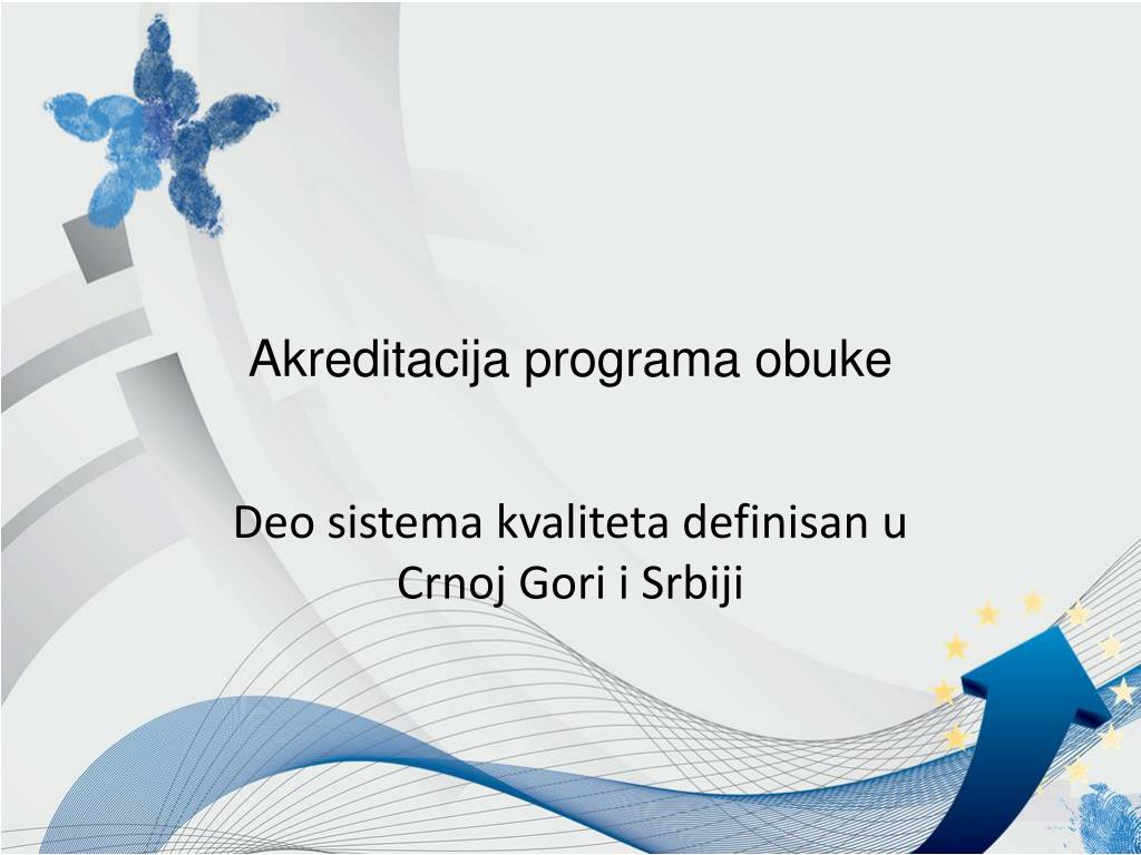 Akreditacija programa/Crna Gora • Akreditacija programa obuke, odnosno programa pružanja usluge je postupak u kome se ocjenjuje da li program obuke,namijenjenstručnim radnicima i stručnim saradnicima kod pružaoca usluge ,odnosno program pružanja usluga ispunjava utvrđene standarde za akreditaciju.