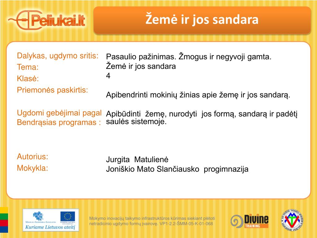 Žemė ir jos sandara Pasaulio pažinimas. Žmogus ir negyvoji gamta. Žemė ir jos sandara 4 Apibendrinti mokinių žinias apie žemę ir jos sandarą. Apibūdinti žemę, nurodyti jos formą, sandarą ir padėtį saulės sistemoje. Jurgita Matulienė Joniškio Mato Slančiausko progimnazija Dalykas, ugdymo sritis: Tema: Klasė: Priemonės paskirtis: Ugdomi gebėjimai pagal Bendrąsias programas : Autorius: Mokykla: