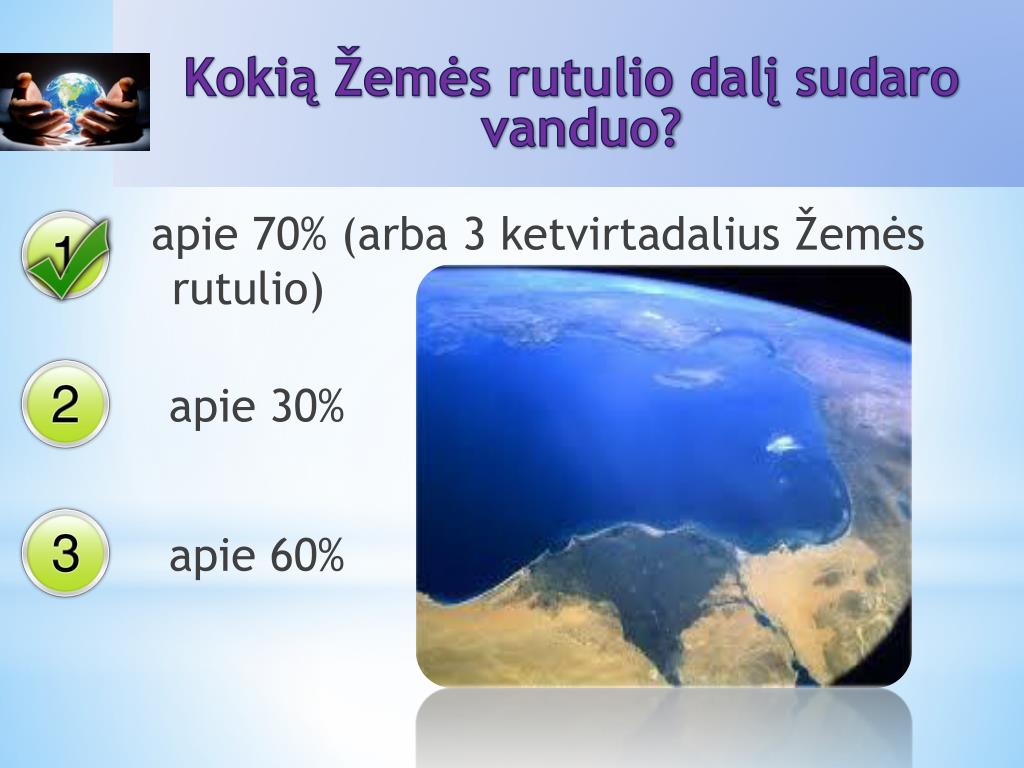 Kokią Žemės rutulio dalį sudaro vanduo? apie 70% (arba 3 ketvirtadalius Žemėsrutulio) apie 30% apie 60%