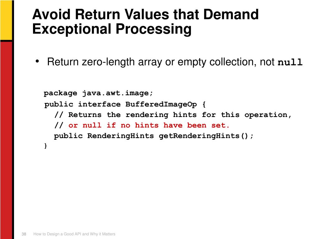 Avoid Return Values that Demand Exceptional Processing • Return zero-length array or empty collection, not null package java.awt.image; public interface BufferedImageOp { // Returns the rendering hints for this operation, // or null if no hints have been set. public RenderingHints getRenderingHints(); }