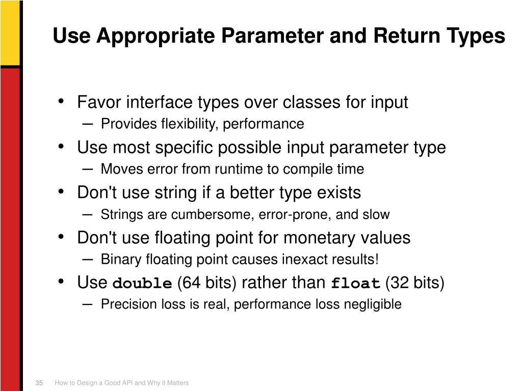 Use Appropriate Parameter and Return Types • Favor interface types over classes for input • Provides flexibility, performance • Use most specific possible input parameter type • Moves error from runtime to compile time • Don't use string if a better type exists • Strings are cumbersome, error-prone, and slow • Don't use floating point for monetary values • Binary floating point causes inexact results! • Usedouble (64 bits) rather thanfloat (32 bits) • Precision loss is real, performance loss negligible