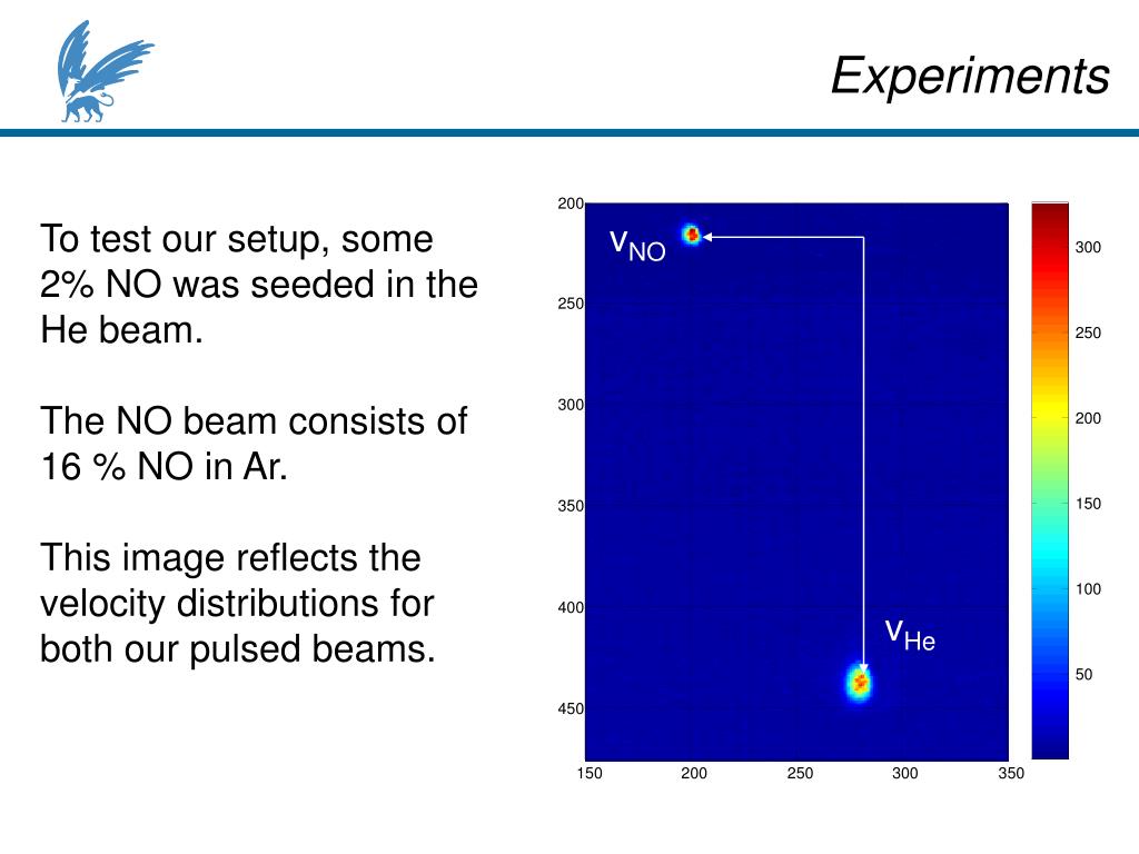 vNO vHe Experiments 200 To test our setup, some 2% NO was seeded in the He beam. The NO beam consists of 16 % NO in Ar. This image reflects the velocity distributions for both our pulsed beams. 300 250 250 300 200 150 350 100 400 50 450 150 200 250 300 350