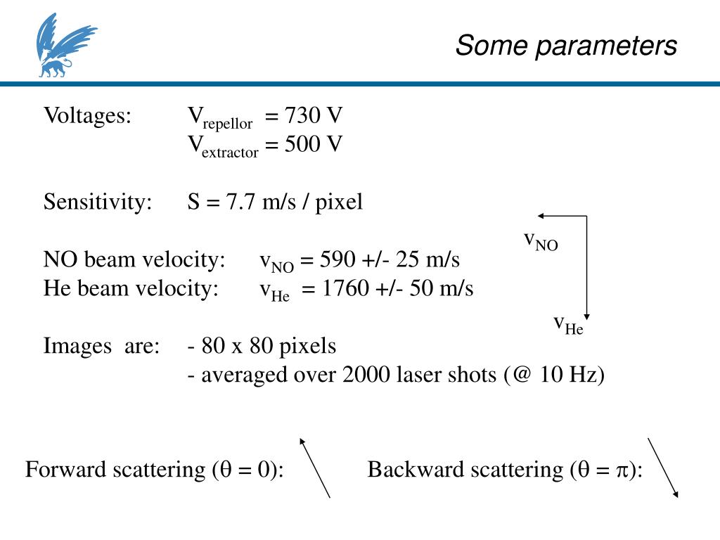 vNO vHe Some parameters Voltages: Vrepellor= 730 VVextractor = 500 V Sensitivity: S = 7.7 m/s/pixel NO beam velocity: vNO = 590 +/- 25 m/s He beam velocity: vHe= 1760 +/- 50 m/s Images are: - 80 x 80 pixels - averaged over 2000 laser shots (@ 10 Hz) Forward scattering ( = 0): Backward scattering ( = ):
