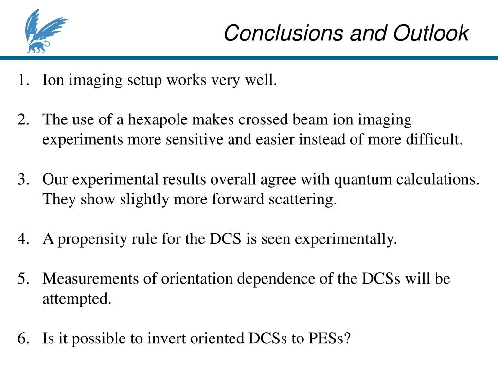 Conclusions and Outlook • Ion imaging setup works very well. • The use of a hexapole makes crossed beam ion imaging experiments more sensitive and easier instead of more difficult. • Our experimental results overall agree with quantum calculations. They show slightly more forward scattering. • A propensity rule for the DCS is seen experimentally. • Measurements of orientation dependence of the DCSs will be attempted. • Is it possible to invert oriented DCSs to PESs?