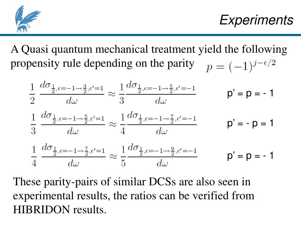 p’ = p = - 1 p’ = - p = 1 p’ = p = - 1 Experiments A Quasi quantum mechanical treatment yield the following propensity rule depending on the parity These parity-pairs of similar DCSs are also seen in experimental results, the ratios can be verified from HIBRIDON results.