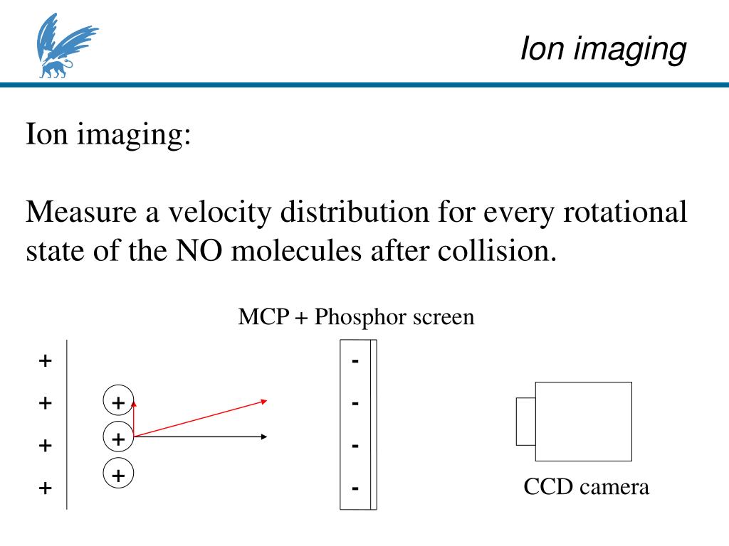 + - + + - + - + + - Ion imaging Ion imaging: Measure a velocity distribution for every rotational state of the NO molecules after collision. MCP + Phosphor screen + CCD camera