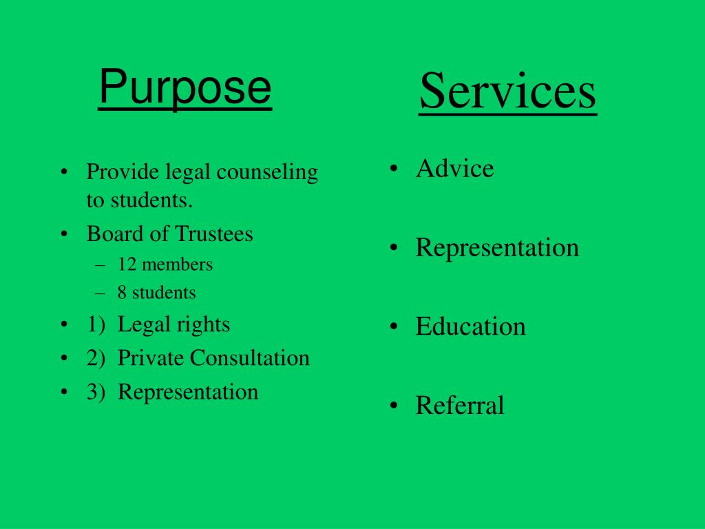 Provide legal counseling to students. Board of Trustees 12 members 8 students 1) Legal rights 2) Private Consultation 3) Representation Advice Representation Education Referral Purpose Services