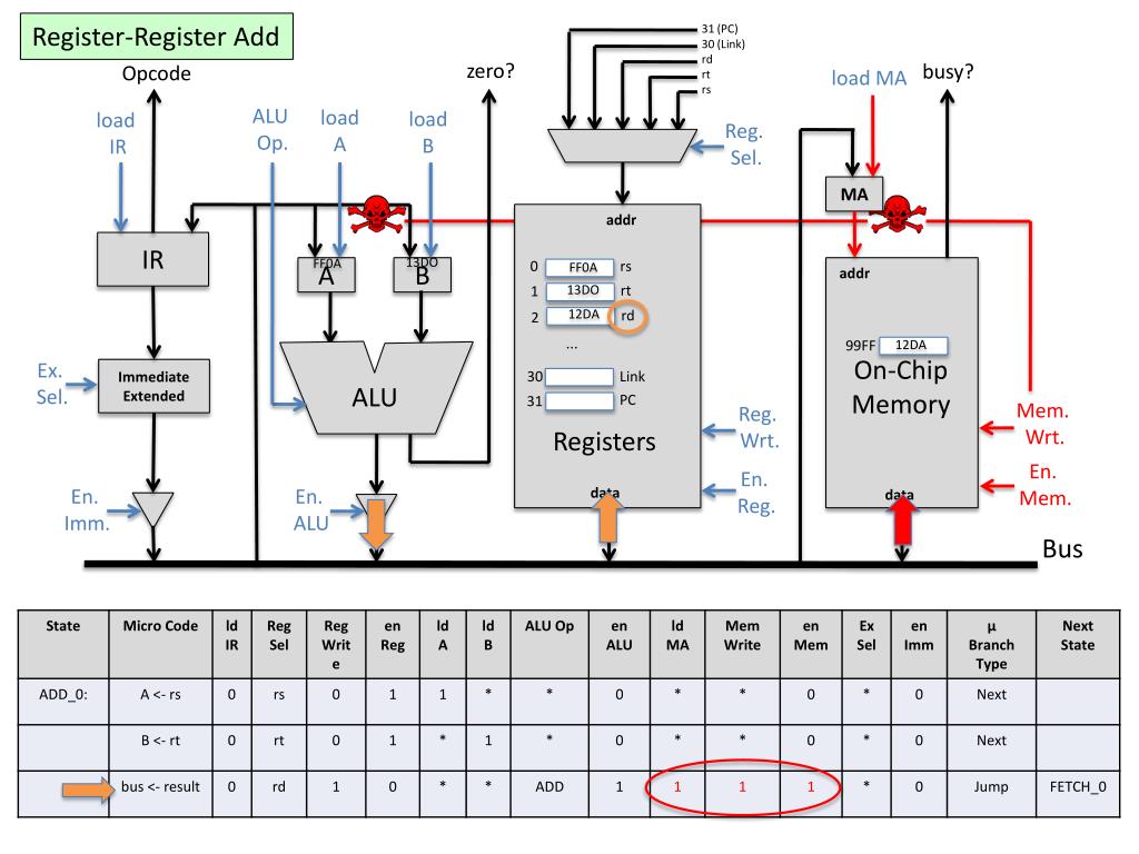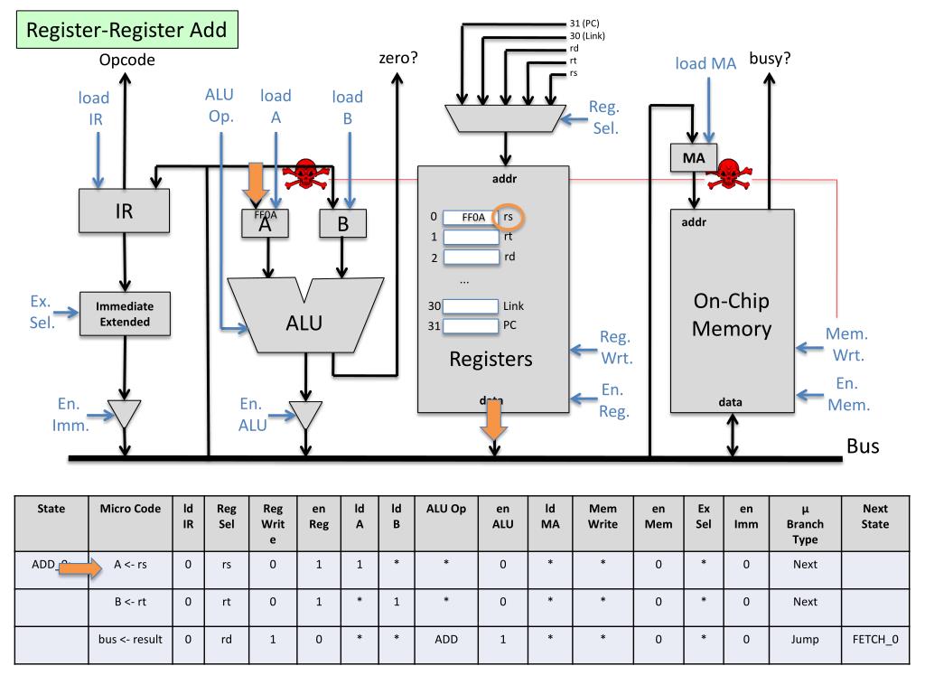 Register-Register Add 31 (PC)30 (Link) rd rt rs zero? busy? Opcode load MA ALU Op. loadA loadB load IR Reg. Sel. MA addr IR 13DO FF0A FF0A 0 rs A B addr 13DO rt 1 12DA rd 2 12DA 99FF ... On-ChipMemory Ex. Sel. Immediate Extended 30 Link ALU PC 31 Mem. Wrt. Reg. Wrt. Registers En. Mem. En. Reg. En. Imm. data En. ALU data Bus Incorrect flow based on current state