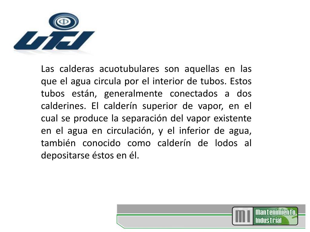 Las calderas acuotubulares son aquellas en las que el agua circula por el interior de tubos. Estos tubos están, generalmente conectados a dos calderines. El calderín superior de vapor, en el cual se produce la separación del vapor existente en el agua en circulación, y el inferior de agua, también conocido como calderín de lodos al depositarse éstos en él.